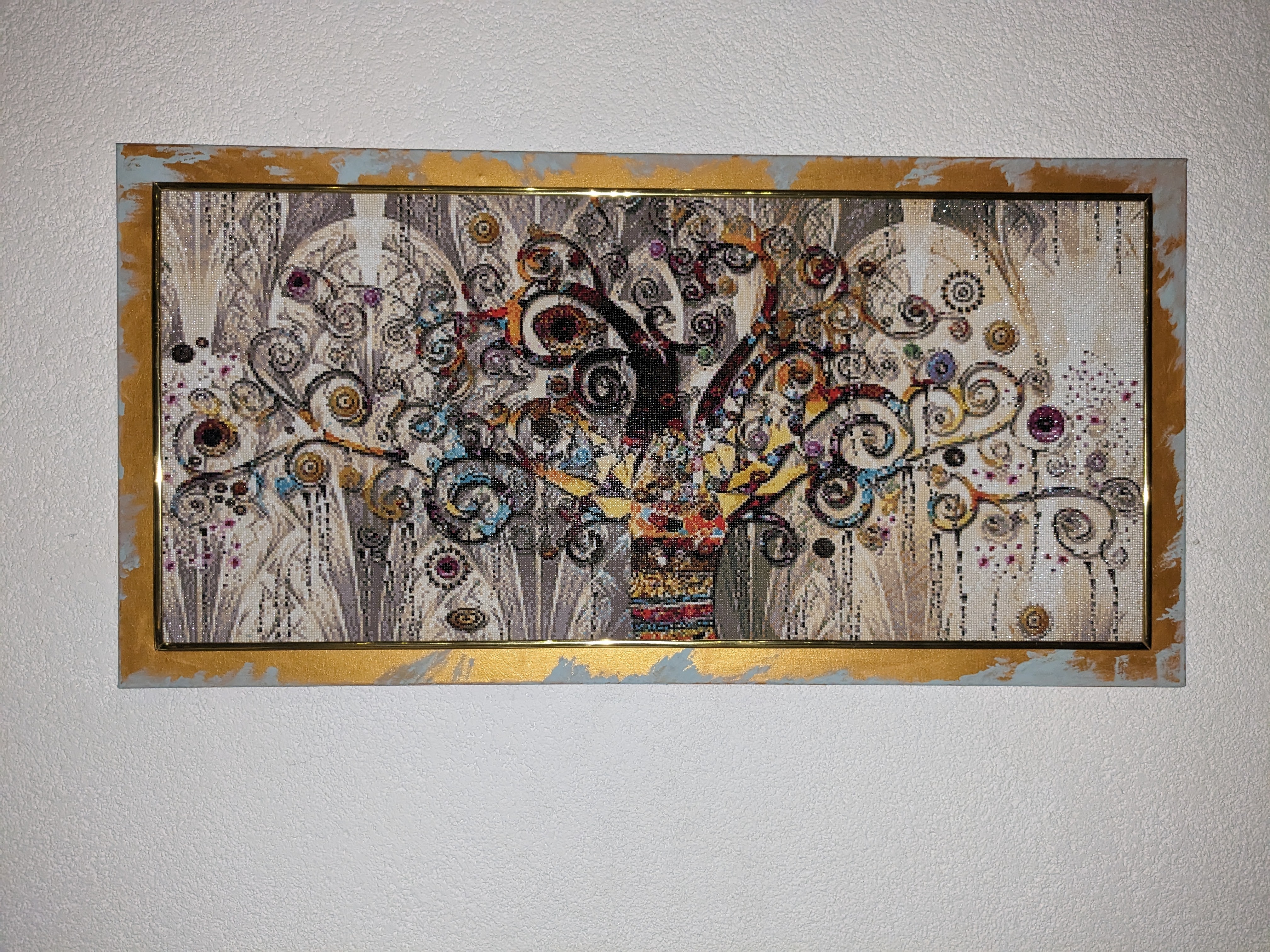 Ich male für das große Bild eine Leinwand an , klebe es mit Montagekleber auf und umrahme es mit goldene Streifen.