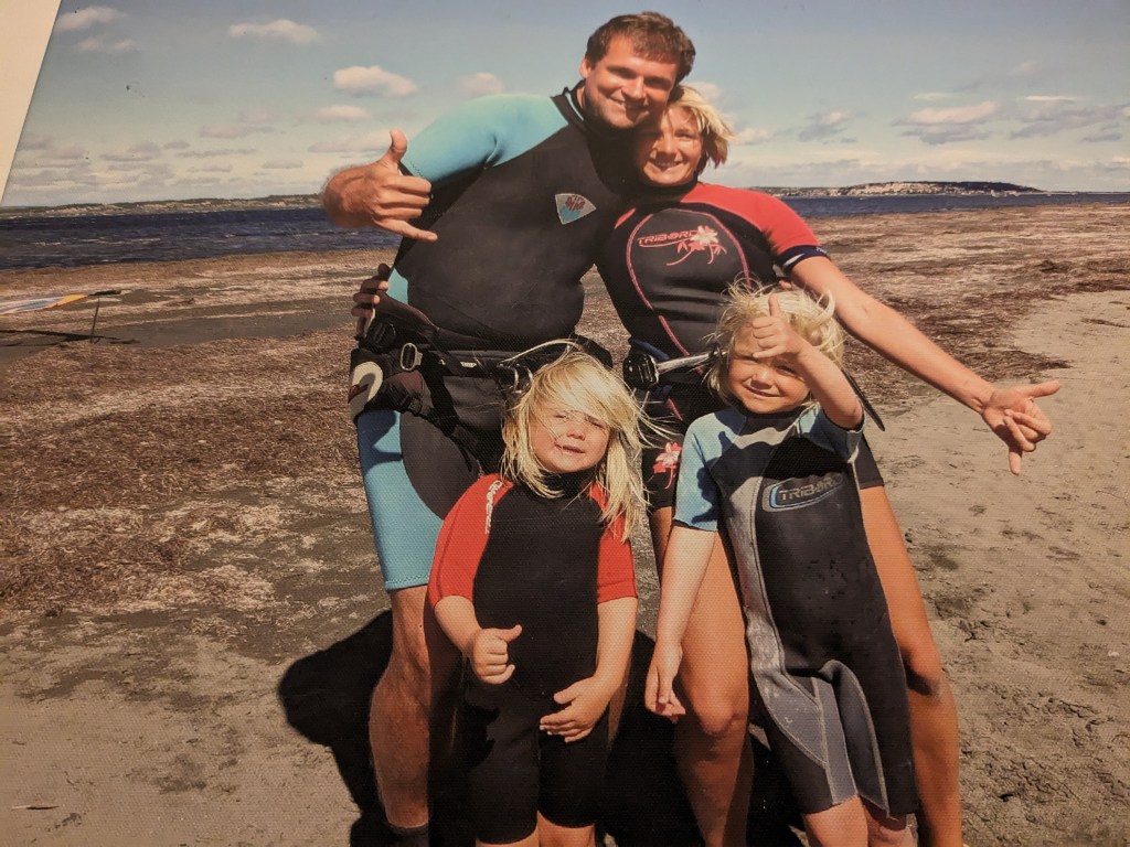 Es zeigt uns alle in Leucate beim Surfen.