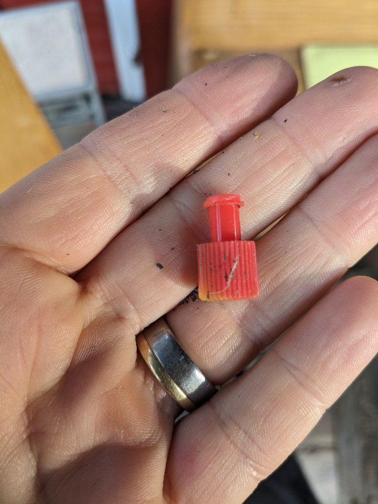 Ich finde vor unsere Gartenhütte einen Verschluss des Infusionsschlauchs von Thomas Morphiumpumpe.
