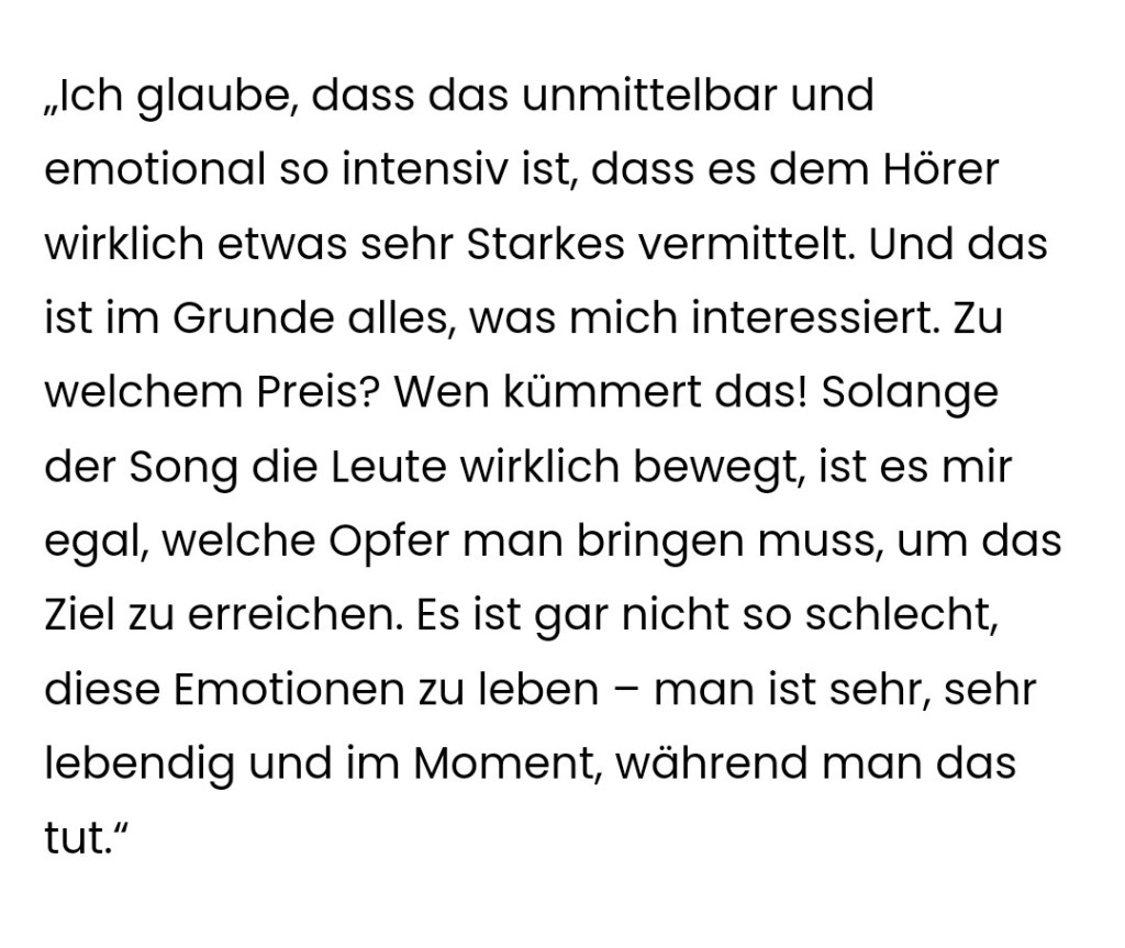 Ich freue mich darauf. Placebos Musik ist besonders, muss sie auch sein, denn ihr Frontmann ist unverwechselbar, etwas skuril und lebt in dieser Musik.