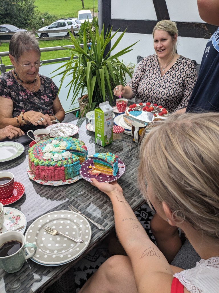 Luise hat eine Torte für Thomas gebacken, nach dem gleichen Rezept wie auf Thomasˋ Trauerfeier. Eine bunte Torte, so bunt wie Thomas war.